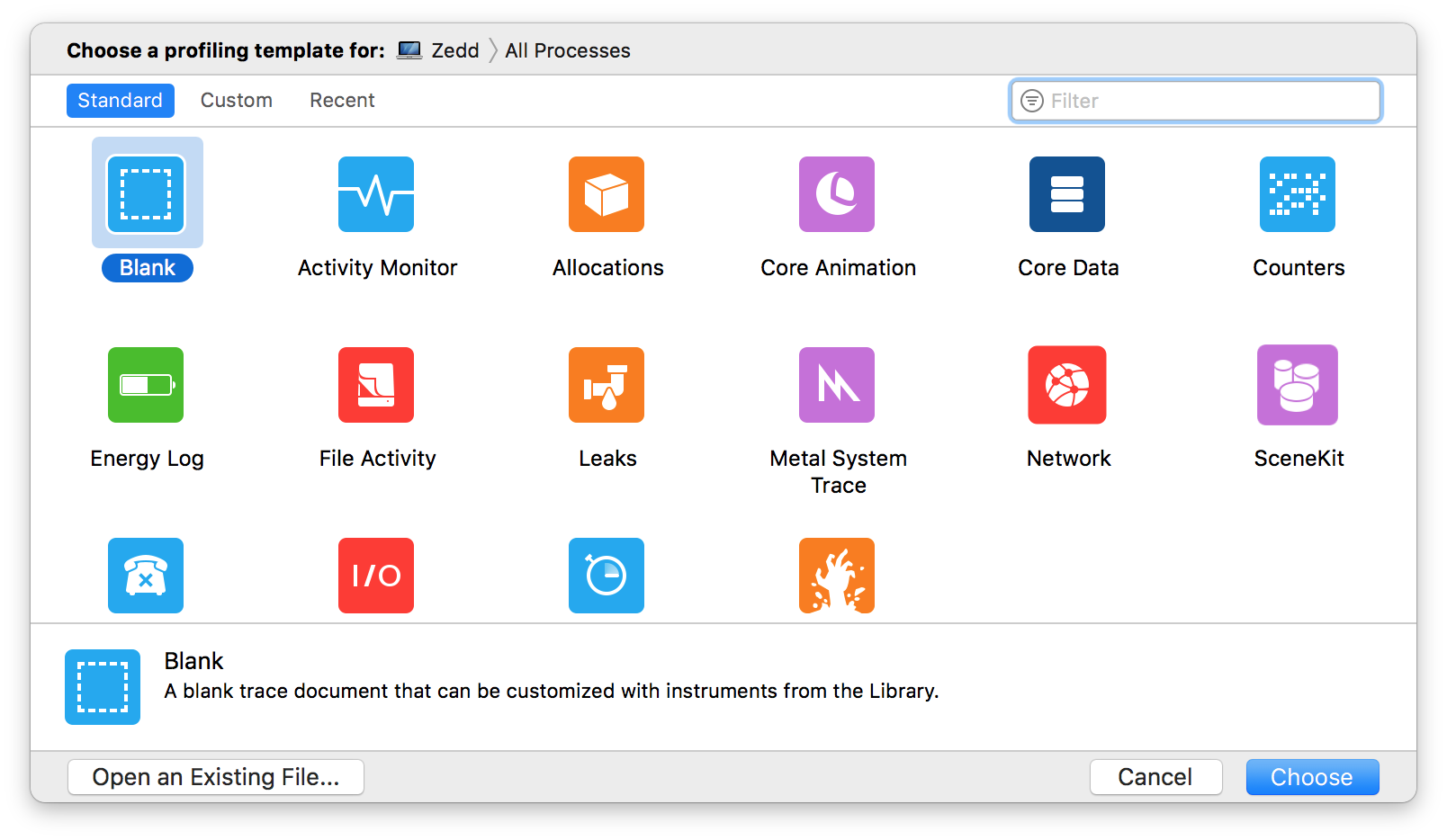 이 중에서 가장 많이 쓰이는 항목인 CPU와 관련된 [Activity Monitor, Time Profiler], 메모리와 간련된 [Allocations, Leaks] 를 알아보도록 하겠습니다.(보통 CPU 관련 항목은 파란색, 메모리 관련 항목은 주황색입니다.)